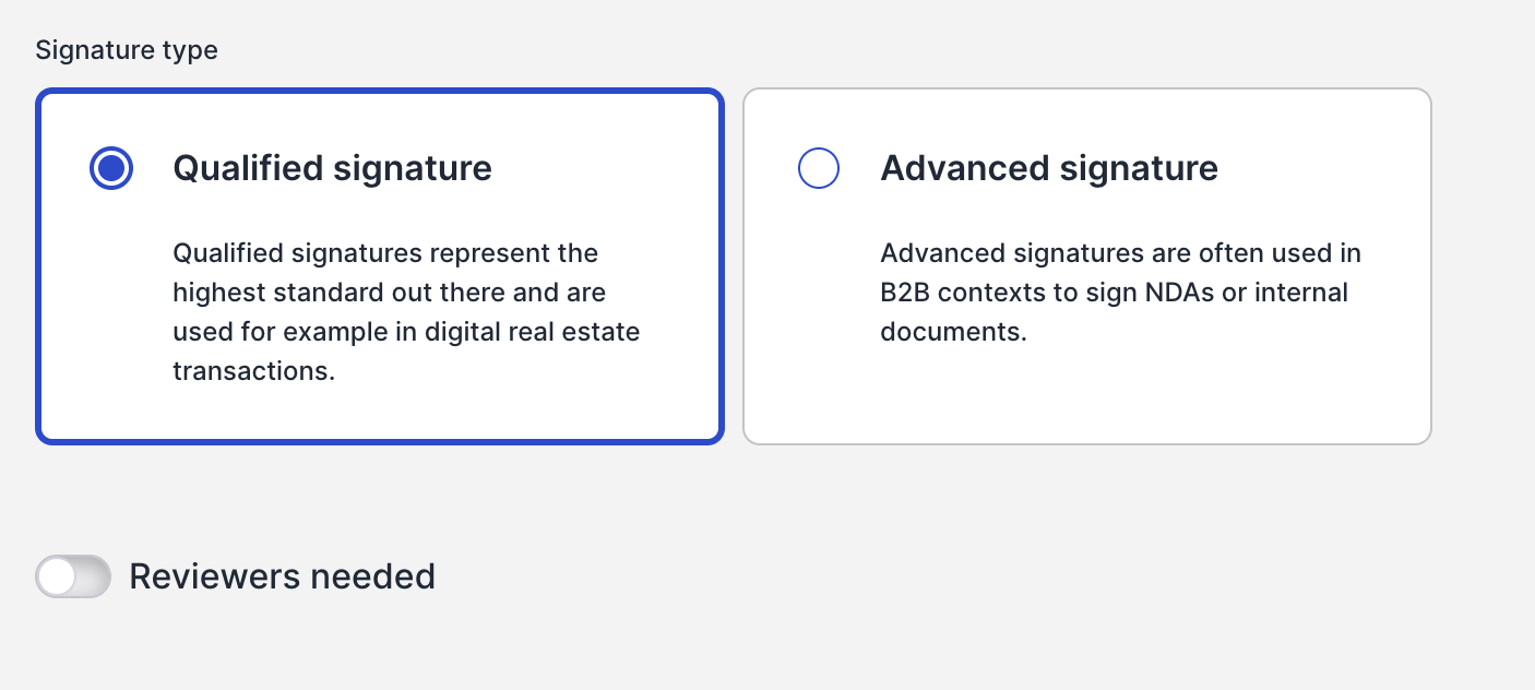In the same section, you can select the type of signature required for your document. Choose between Qualified Signatures or Advanced Signatures based on your compliance needs. Not sure which one is right for you? Check out our signature types guide for more information.